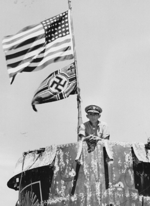 Capt. Daniel V. Gallery stands on bridge of the captured German U-boat, U-505. |