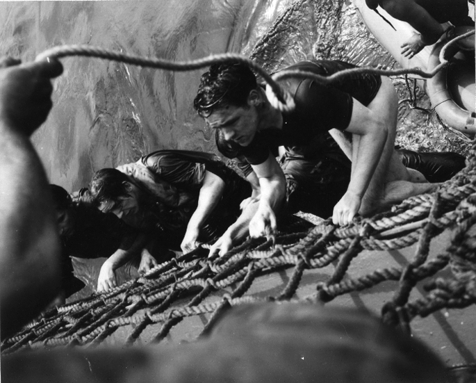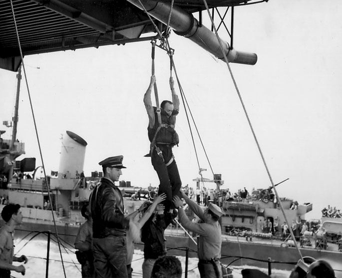 crewmen climb aboard USS Pope, 9 April 1944 |